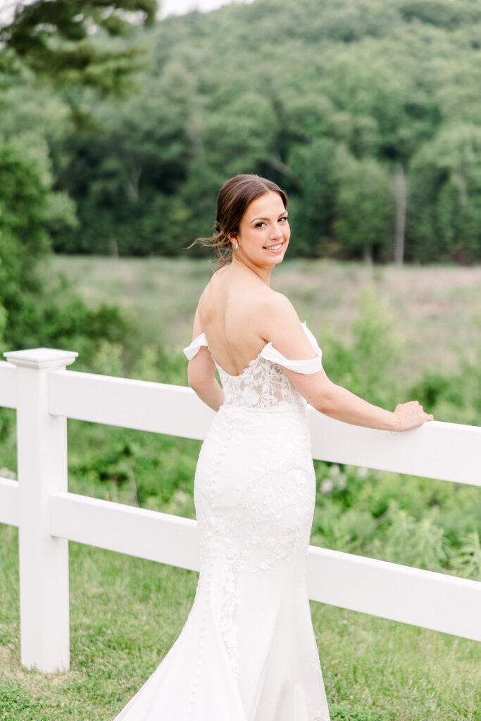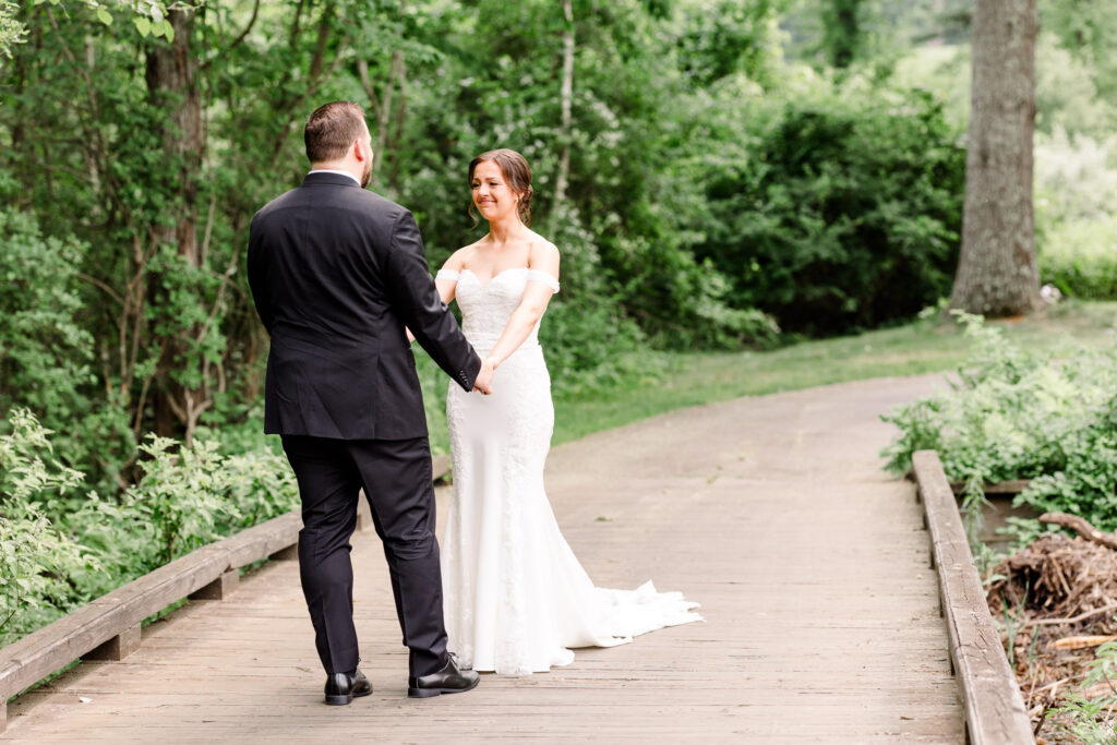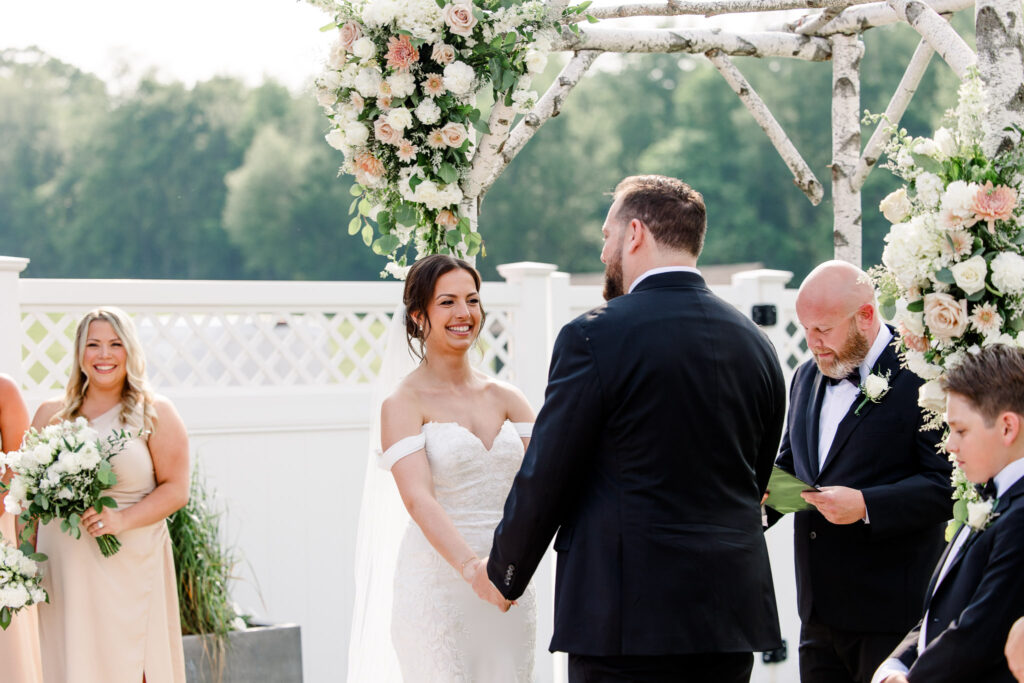 The setting was nothing short of stunning. The grounds at the Barn at Blackstone National are a photographer’s dream… rolling greens, white fences, and a bright birchwood arbor adorned with florals that looked like they had bloomed just for Laura and Mark.
